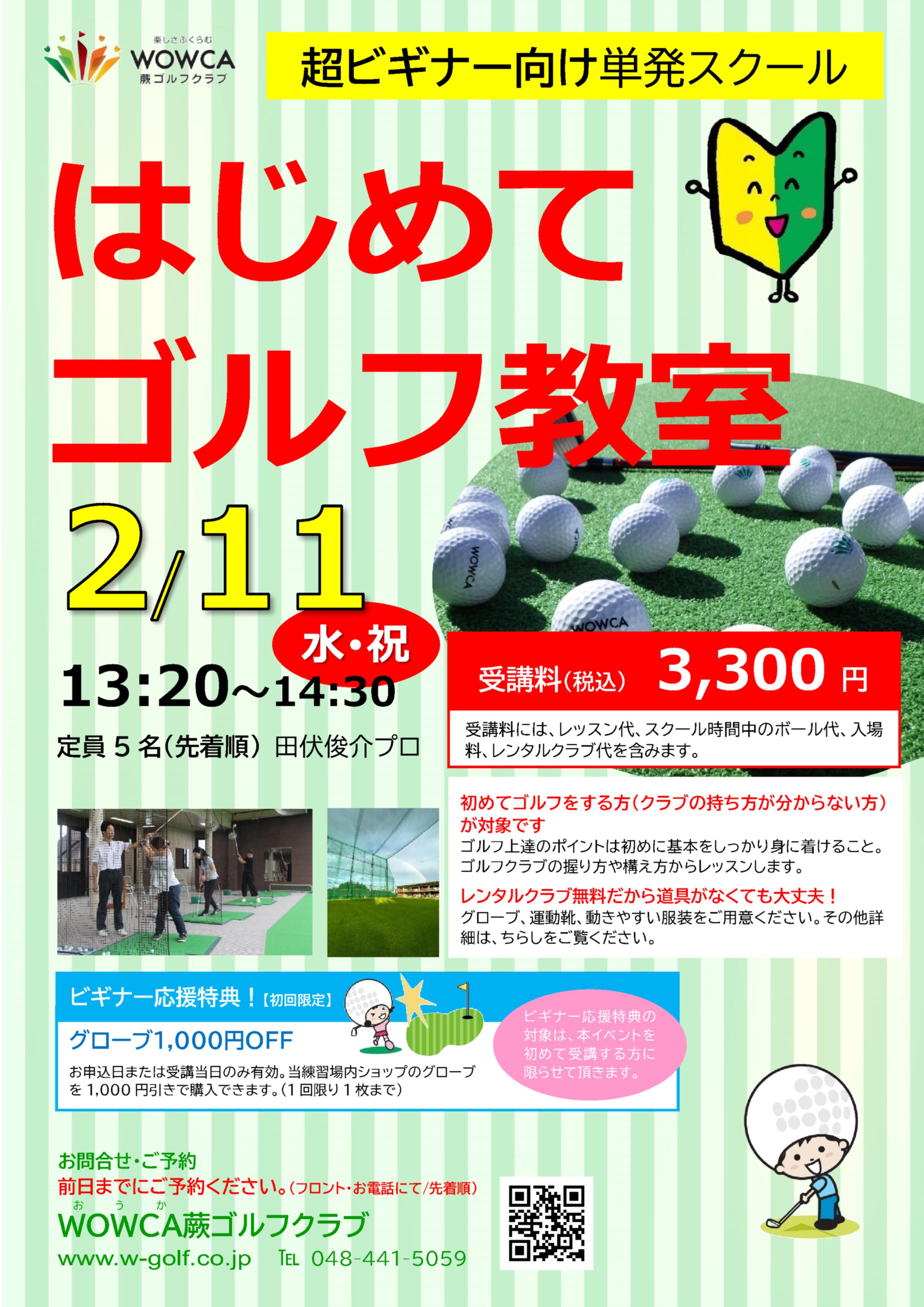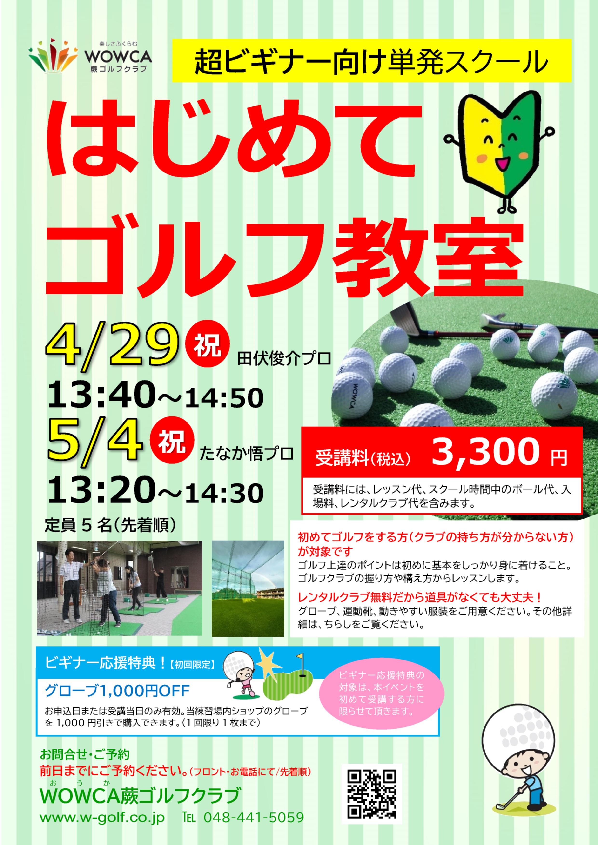 WOWCAゴルフスクールを体験受講できます。ゴルフをこれから始める方もお気軽にお申し込みください。ゴルフクラブは無料レンタルがございます! 【料金】 2,000円(税込) ※入場料、ボール代、レッスン代が含まれます。 【お申込み】 フロントまたはお電話にてお申し込みください。(お申込日より1週間以内のクラスをお選びください。) ※詳細はこちらのチラシ(PDFファイル)をご覧ください。 ※体験スクールをお電話で申し込まれた方は、事前に「体験スクール受講の方へ」をお読みください。 |