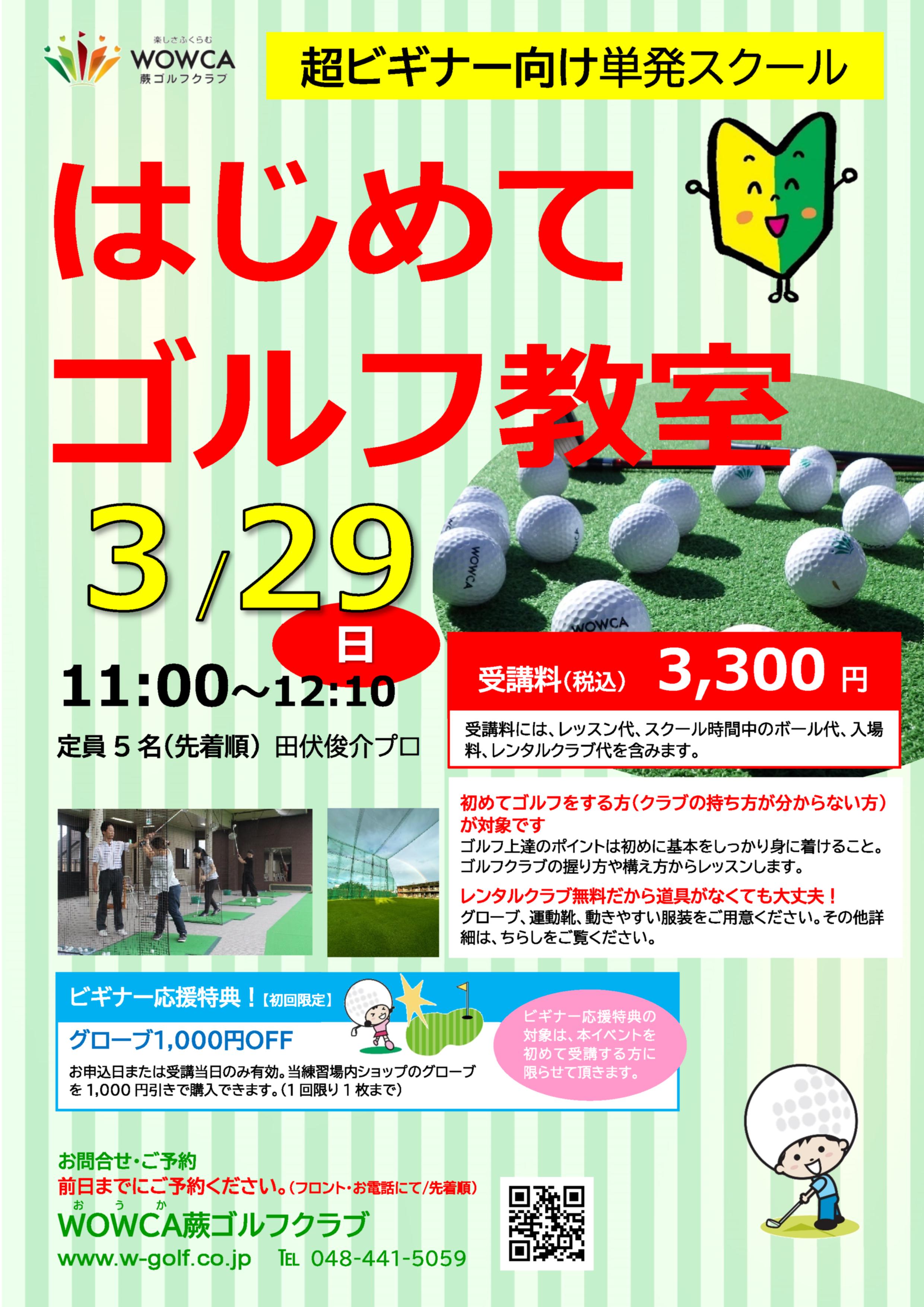 WOWCAゴルフスクールを3週続けて受講できる「短期コース」を開講しています!詳細はポスター、店頭チラシをご覧ください。ぜひこの機会に、ゴルフスクールでプロレッスンをお試しください。 【料金】 平日昼間 8,670円(税込) 夜間 9,360円(税込) 土日昼間 10,410円(税込) ※入場料、ボール代、レッスン代が含まれます。 【お申込み】 フロントにてお申し込みください。 |