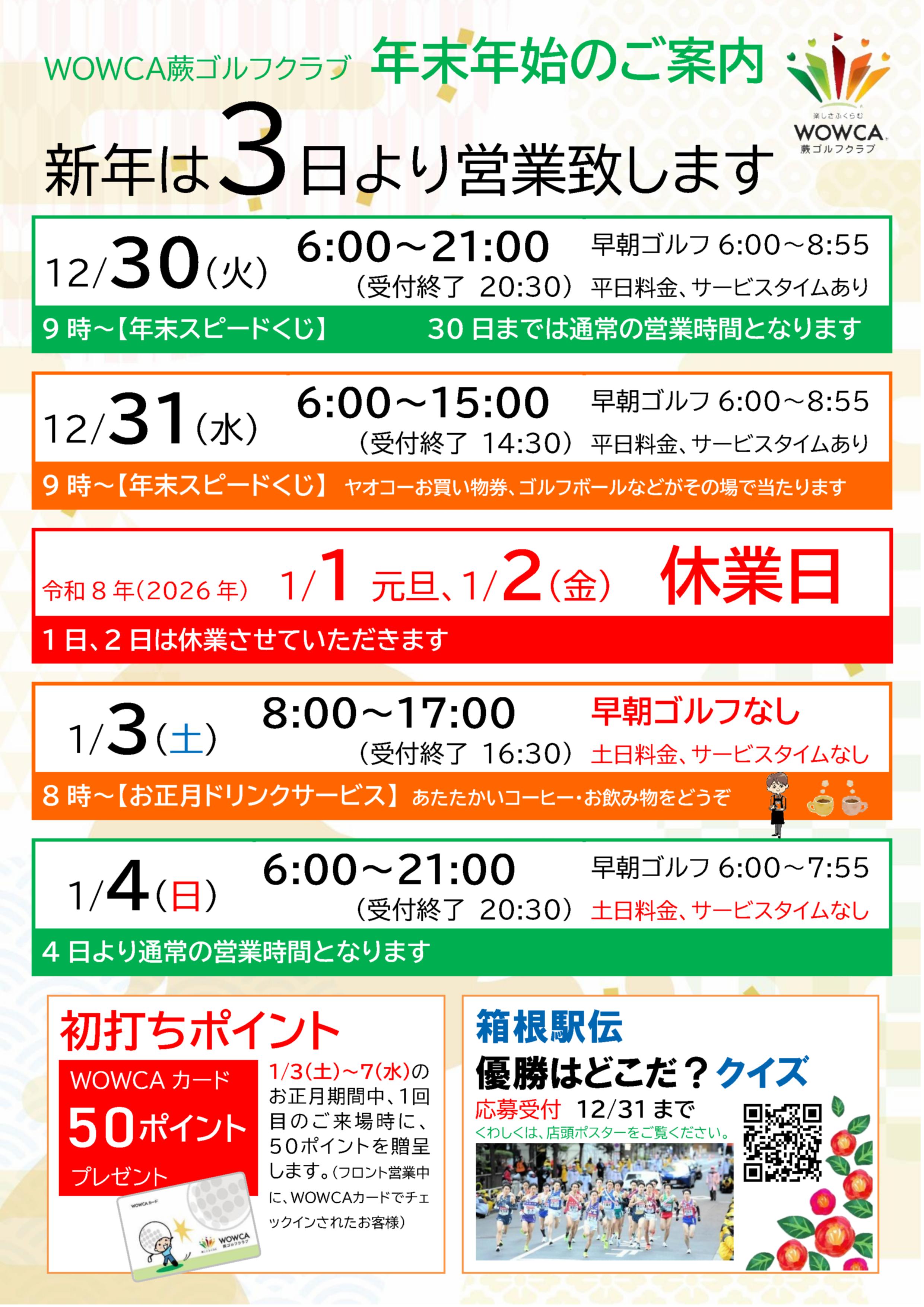 WOWCAゴルフスクールを体験受講できます。ゴルフをこれから始める方もお気軽にお申し込みください。ゴルフクラブは無料レンタルがございます! 【料金】 2,000円(税込) ※入場料、ボール代、レッスン代が含まれます。 【お申込み】 フロントまたはお電話にてお申し込みください。(お申込日より1週間以内のクラスをお選びください。) ※詳細はこちらのチラシ(PDFファイル)をご覧ください。 ※体験スクールをお電話で申し込まれた方は、事前に「体験スクール受講の方へ」をお読みください。 |
